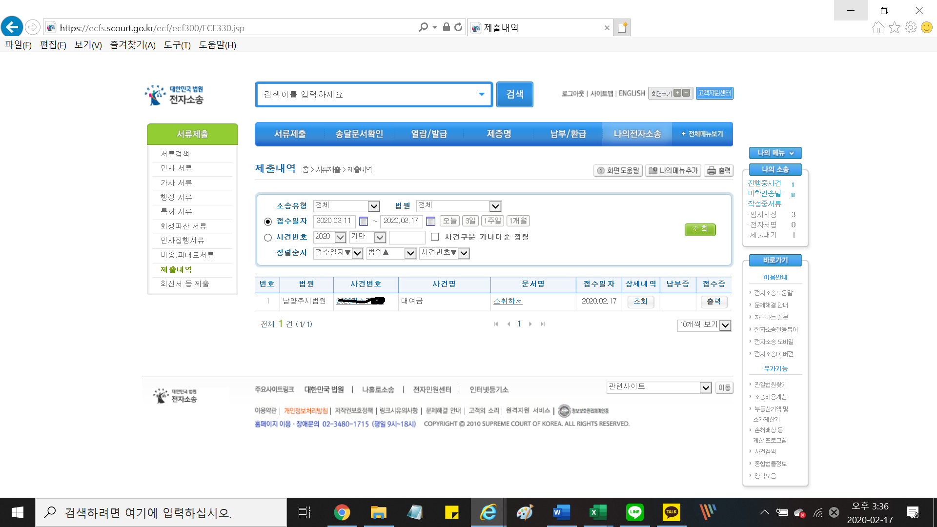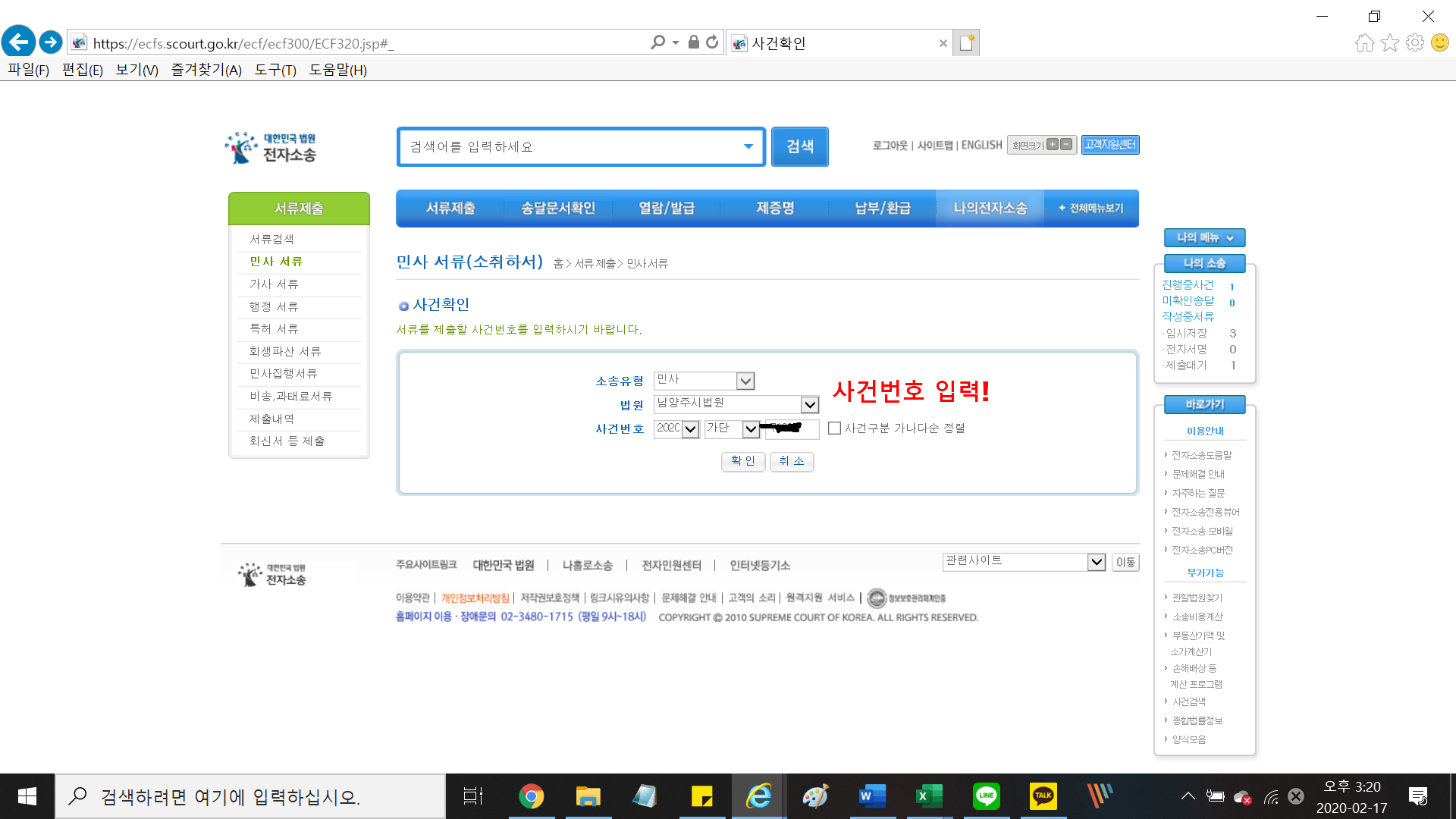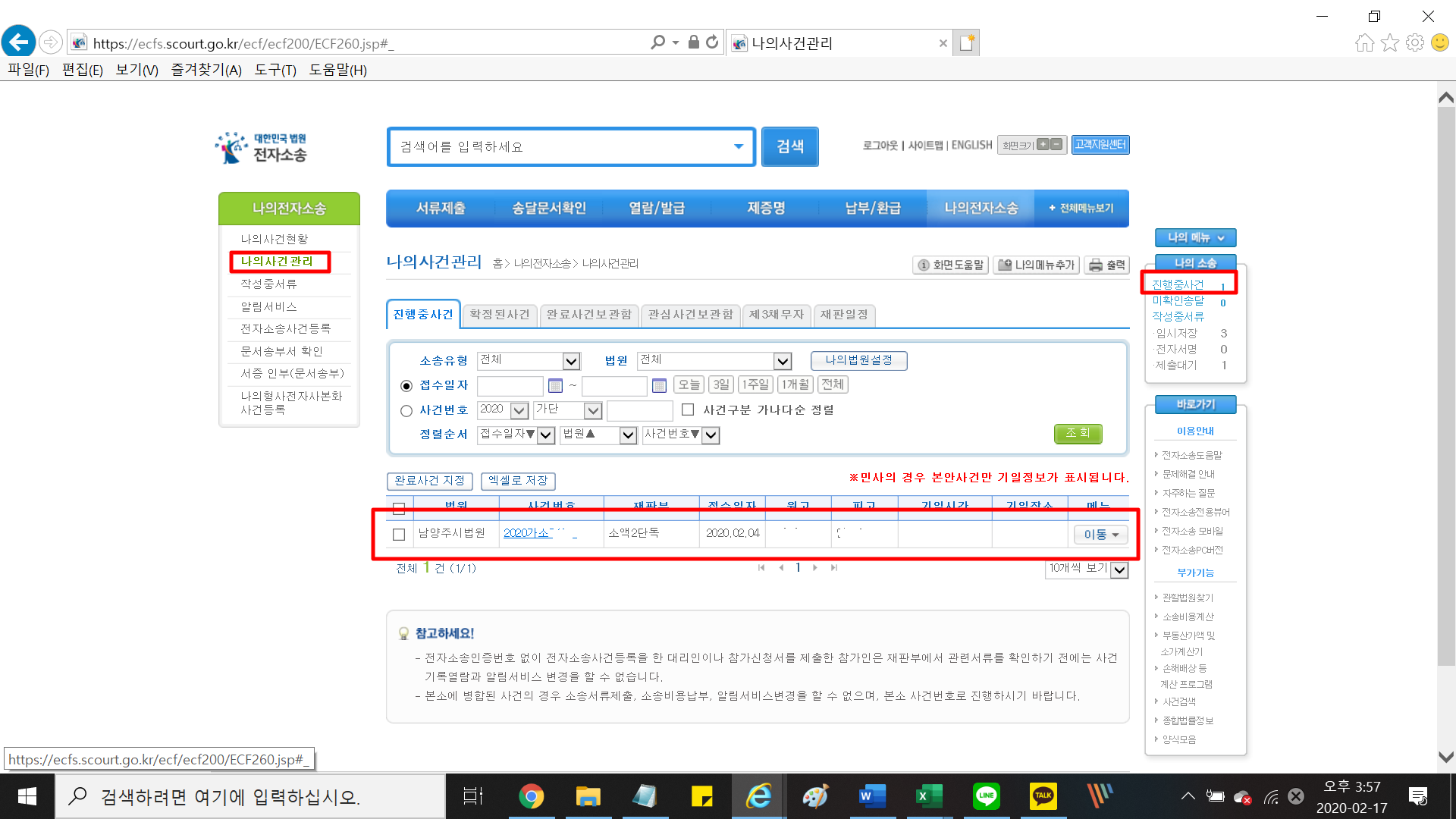 1. 공인인증서 로그인을 한 다음, 진행 중인 사건을 확인해본다.