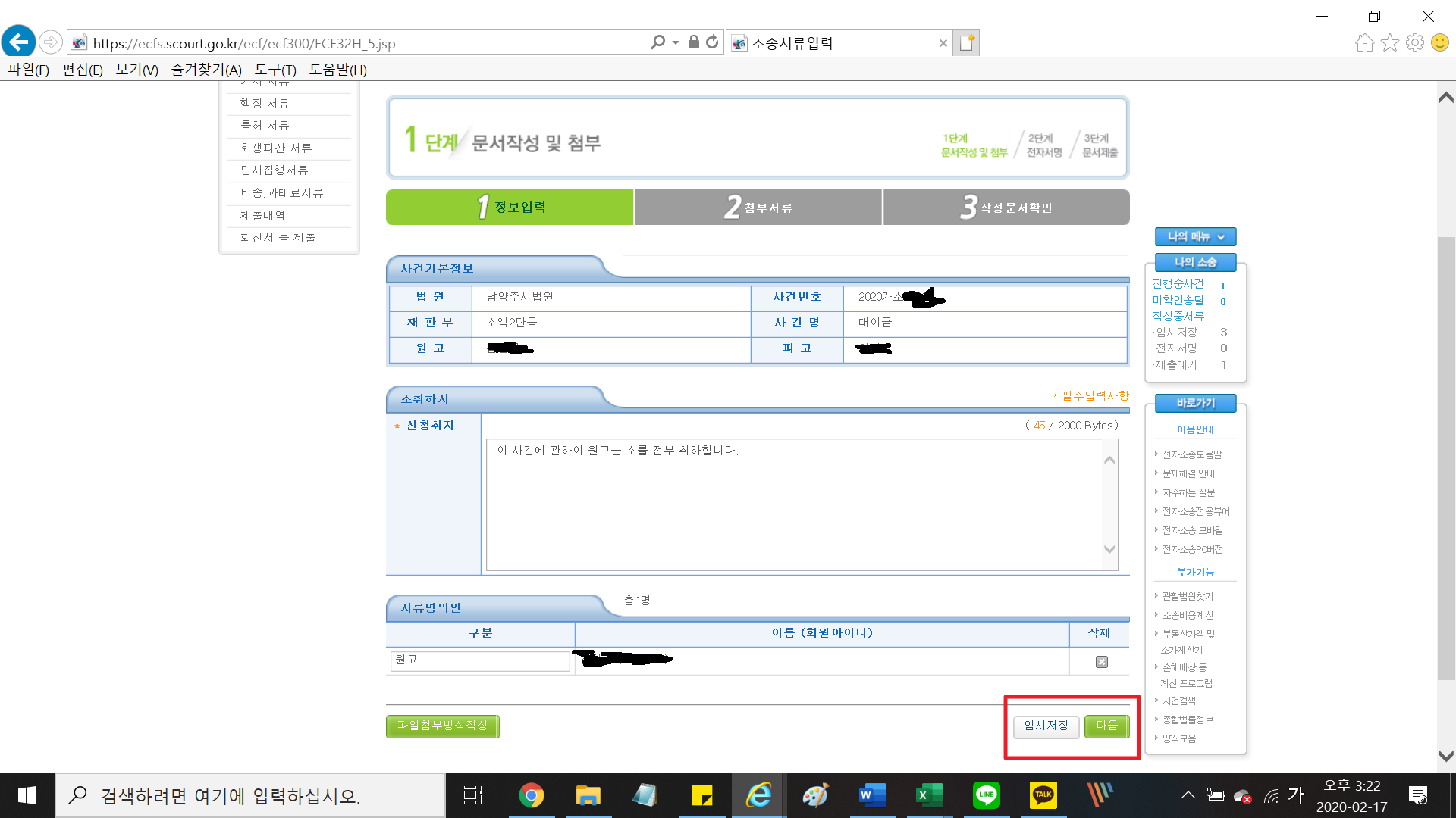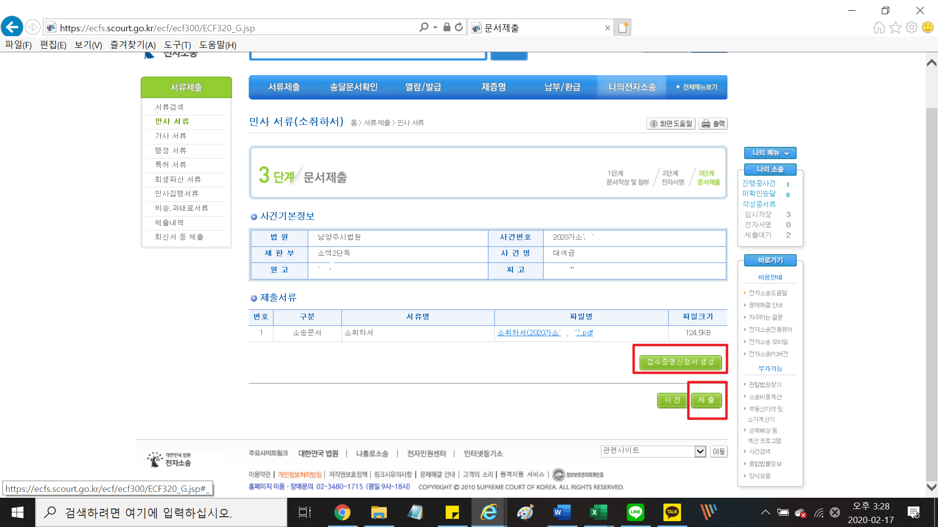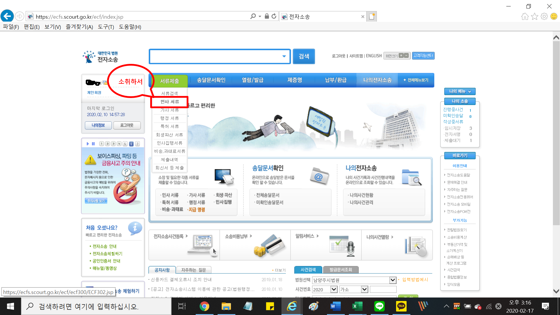 1. 공인인증서 로그인을 한 다음, 진행 중인 사건을 확인해본다.