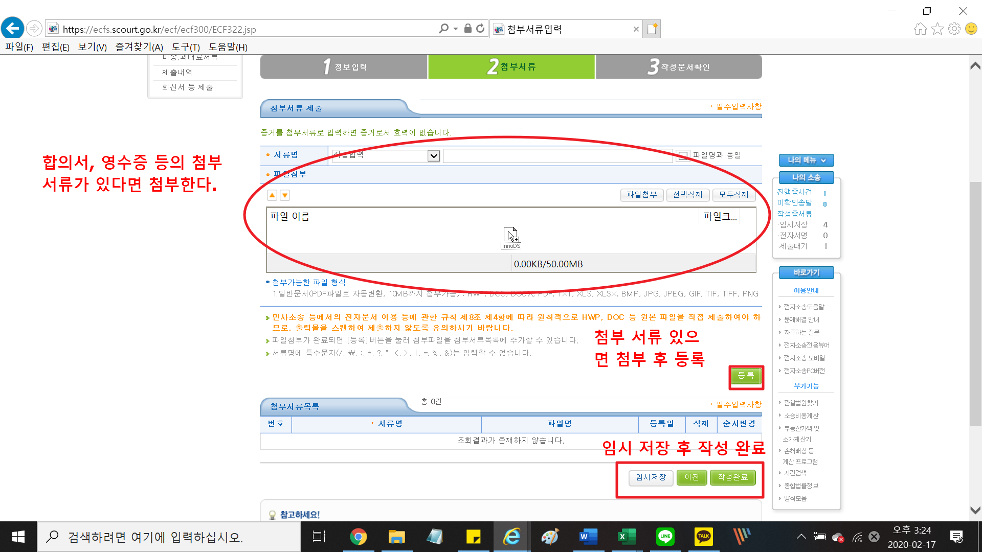 2. 첨부할 서류를 첨부하였으면 등록 - 임시저장 - 작성완료!
