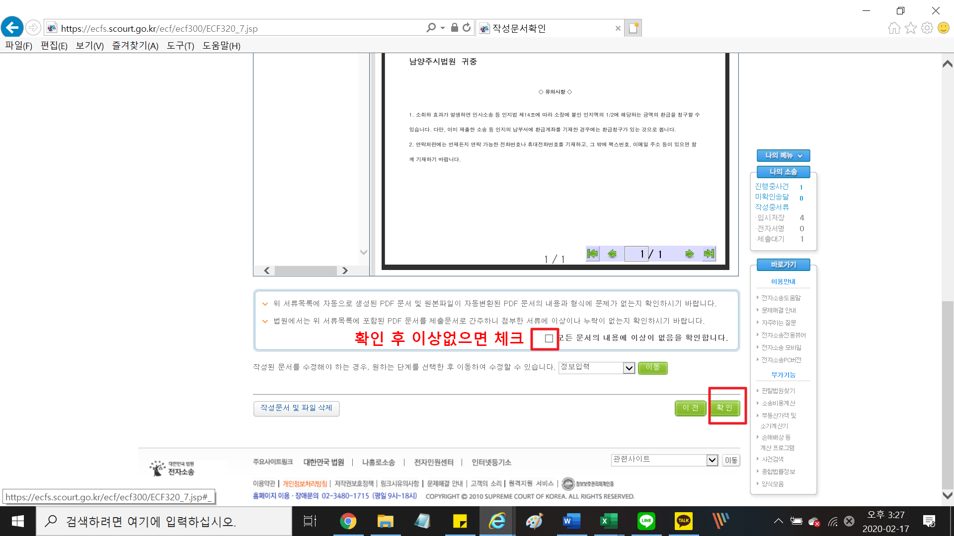 2. 이상이 없으면 '모든 문서의 내용에 이상이 없음을 확인합니다.' 란에 체크 표시하고 확인!
